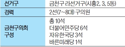 전체 의원이 10명(민주당 6명·자유한국당 3명·바른미래당 1명)인 금천구의회는 작지만 강한 자치구의회의 모습을 보여 주고 있다. 재선 이상 의원이 7명으로 지역 현안에 대한 이해와 의정 활동 경험이 풍부한 의원들이 많다. 또 초선의원 3명도 전문성을 갖췄다는 평가를 받는다.
