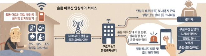 아이 가방에 달린 사물인터넷(IoT) 센서를 이용해 어린이집에 안전하게 등원했는지 파악한다. 혼자 사는 어르신의 집에 설치된 IoT 기기로 온도와 습도, 방 안에서의 움직임 등을 감지해 만약의 사고를 막을 수 있다. 스마트도시 구현에 앞장선 서울 구로구에서는 이런 서비스가 미래의 일이 아닌 현재 진행형이다.구로구는 올해 IoT 기반 통신 인프라인 로라(LoRa)망을 완전히 구축했다. 구로구 내에서는 어디서든 IoT를 이용한 서비스가 가능해졌다는 의미다. 구로구는 로라망 구축이 완성된 이후 기술을 행정 서비스에 접목시키는 실험을 진행하고 있다. 인프라가 완전히 조성된 만큼 IoT를 통해 안전, 복지, 교통, 환경 등 다양한 도시문제를 해결한다는 복안이다. 실제로 구로구는 지난 7월부터 IoT 기술을 접목해 혼자 사는 어르신, 치매 어르신, 어린이 등 사회 취약계층에 대한 안심케어 서비스 사업을 시범으로 하고 있다.