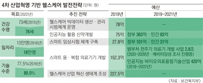 보건복지부는 10일 이런 내용을 담은 ‘4차 산업혁명 헬스케어 발전전략’을 대통령 직속 4차산업혁명위원회 제9차 회의 심의를 거쳐 최종 확정했다고 밝혔다. 이번 전략은 세계적으로 고속 성장하고 있는 헬스케어 분야를 혁신성장의 동력으로 삼기 위해 마련됐다. 목표는 건강수명을 2015년 73세에서 2022년 76세로, 바이오헬스 분야 일자리는 2016년 13만명에서 2022년 18만명으로 끌어올리는 것이다.
