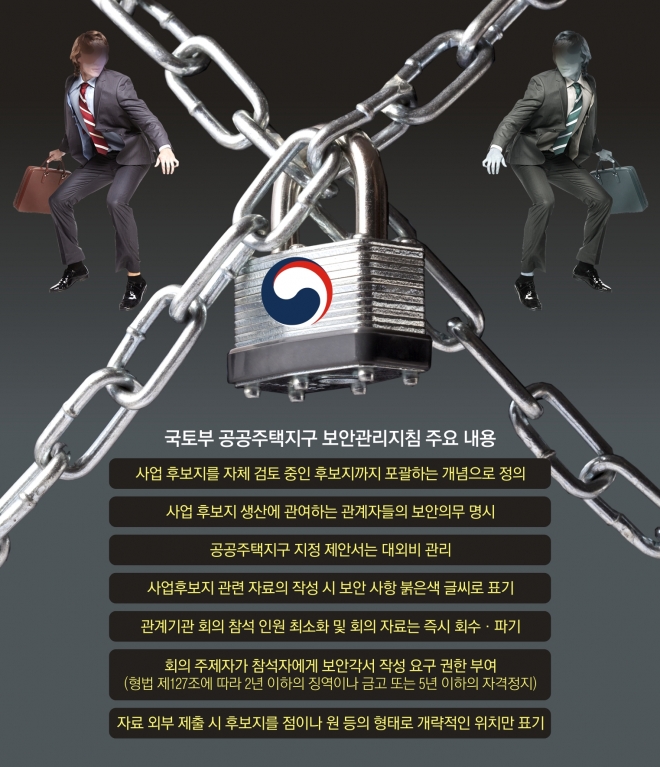 지침은 공공택지 사업 후보지에 대한 자료를 생산·취득하는 공공주택사업자와 관계기관에 보안 의무를 지우고, 공공택지 지정 제안서 등 관련 문서는 대외비로 철저하게 관리하도록 했다. 또 이메일을 통해 자료를 송부할 때는 전자 문서에 암호를 반드시 설정해야 한다. 회의가 열리면 참석 인원을 최소화하고, 회의가 끝난 뒤에는 자료를 모두 회수해 파쇄하도록 했다. 여기에 국회와 지방의회 등을 상대로 사업 설명을 할 때는 해당 지역과 관련된 자료만 제공하고, 도면에는 대상 지역을 모호하게 표기하도록 했다.