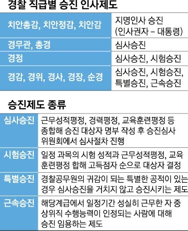 경정 이하 경찰관은 최저근무연수를 채운 뒤 필기·면접·교육훈련성적 등을 반영한 시험승진, 근속승진, 특별승진, 심사위원회를 거치는 심사승진으로 진급한다. 대부분 시험승진으로 진급하다 보니 시험공부를 하면서 업무에 소홀하거나, 공부 시간을 내기 쉬운 업무를 맡으려는 문제가 일선에서 발생한다.