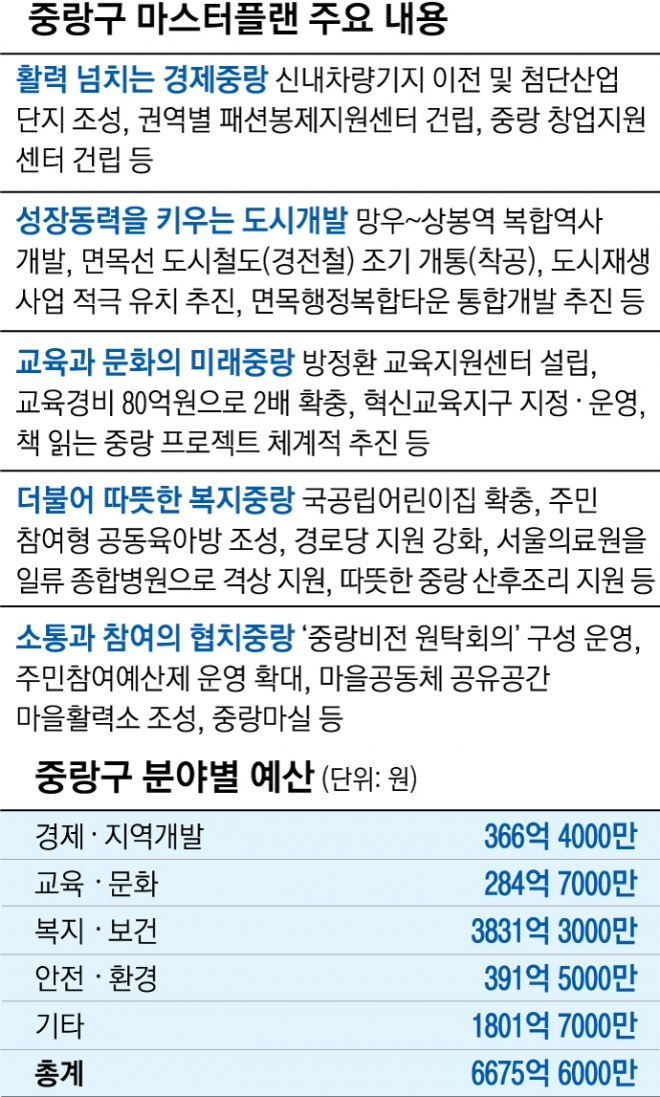 도시개발도 절실하다. 면목행정복합타운 통합개발, 면목유수지 복합 문화 공간 조성, 면목선 도시철도 2022년 이내 조기 착공 등으로 면목동 지역 개발에 힘써 중랑구의 남북 균형 발전을 이루겠다. 철도와 버스 환승 체계를 갖춘 망우·상봉역 복합역사 개발 사업 등으로 지역에 활기를 불어넣을 것이다. 이 밖에도 중랑구에는 65세 이상 노인이 6만 5000여명, 그중 독거 노인이 1만 4000여명이며, 등록된 장애인은 2만여명, 기초생활 수급자가 1만 6000여명, 보육을 필요로 하는 아이들은 약 8000명에 달하는 등 우리가 보살펴야 하는 이들이 많다. 이들을 위한 맞춤형 복지 계획도 확충해 나갈 방침이다.
