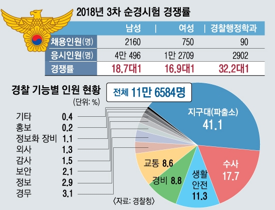 지난해 12월 2160명을 뽑는 순경 공채 일반 전형에서는 4만 496명이 몰려 18.7대1의 경쟁률을 보였다. 여성의 경우 750명 선발에 1만 2709명이 응시해 16.9대1의 경쟁률을 기록했다. 순경 공채의 높은 경쟁률은 어제오늘의 일이 아니다. 한때 순경 공채의 평균 경쟁률은 40대1을 넘기도 했다. 이처럼 경찰을 꿈꾸는 지원자들은 해마다 치열한 경쟁을 뚫어야만 제복을 입을 수 있다.