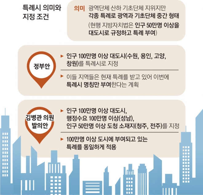 지자체들의 이런 요구는 정부안에 맞서 김병관(성남 분당갑) 더불어민주당 의원이 지난해 12월 대표 발의한 개정안에 담겼다. 이 안에는 특례시로 지정되면 인구를 따지지 말고 100만명 이상 대도시에 부여되는 특례를 모두 주자는 내용도 포함됐다. 청주(85만명)와 전주(65만명)가 특례시가 되면 수원(125만명)이 현재 받는 혜택을 똑같이 누리는 것이다.