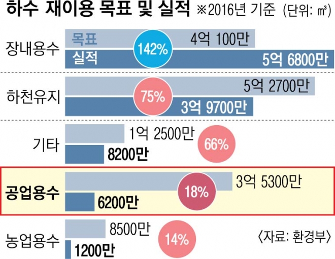 2017년 환경부 하수도통계에 따르면 하수 재이용량은 총방류량(70억㎥)의 15.9%(11억 1000만㎥)에 그쳤다. 더욱이 하루 처리용량이 500㎥ 이상인 전국 660개 공공하수처리시설 중 599곳이 하수를 재이용하지만 대부분 시설 내 용수(51%)와 하천유지용수(39%)로 활용하는 것으로 나타났다. 이학수 수공 사장은 “호주와 싱가포르를 비롯해 물 부족 국가에서는 재이용하는 하수를 실효성이 높은 대체 수자원으로 평가한다”고 말했다.