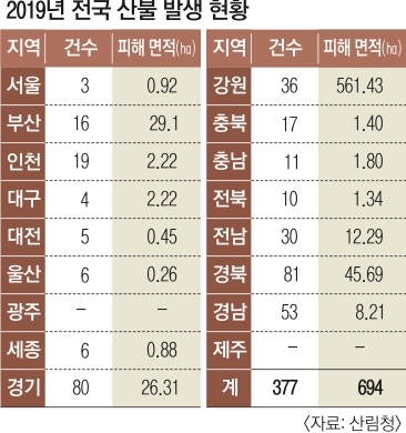 8일 산림청에 따르면 전국에서는 지난 7일 현재 올 들어서만 377건의 산불이 발생해 삼림 694㏊를 태웠다. 경북 81건 45.69㏊, 경기 80건 26.31㏊, 강원 36건 561.43㏊, 경남 53건 8.21㏊, 전남 30건 12.29㏊, 부산 16건 29.1㏊ 등이다.