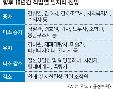 박가열 고용정보원 연구위원은 “일자리 증감은 기술혁신뿐만 아니라 사회·문화적 환경, 정부의 정책과 제도의 상호작용을 반영한 것”이라고 설명했다. 전체 직업 전망에 대한 자세한 내용은 고용정보원 웹사이트(www.keis.or.kr)에서 확인할 수 있다.