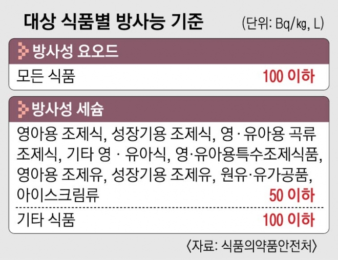 개정안에 따르면 모든 식품은 방사성 요오드 100Bq/㎏ 이하를 지켜야 한다. 기존에는 영유아 식품과 유제품, 아이스크림류는 100Bq/㎏ 이하, 기타 식품은 300Bq/㎏ 이하를 적용했다. 방사성 세슘 기준은 영유아 식품과 유제품, 아이스크림류는 50Bq/㎏ 이하, 기타 식품은 100Bq/㎏ 이하여야 한다.
