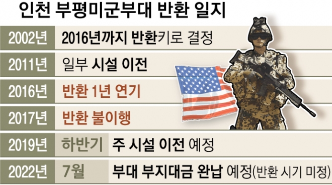 6일 인천시에 따르면 면적 44만㎡인 부평미군부대(캠프마켓)는 2002년 반환 계획이 결정됐으나 미군 평택기지 조성이 늦어지면서 이전이 계속 미뤄져 왔다. 일부 시설은 2011년 경북 김천으로 옮겨갔으나 주 시설(빵 공장)은 올 하반기 이전 예정이다. 부대 반환엔 이전이 선행돼야 하는데 한참이나 진척을 이루지 못한 것이다.