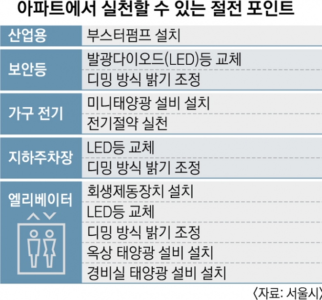서울시가 이 같은 에너지자립마을에서 수집 및 비교·분석한 자료를 바탕으로 아파트에서 실천할 수 있는 12개의 절전 포인트를 정리했다. 아파트단지의 규모가 달라도 요소별 전기 사용량 비중은 비슷해서 에너지자립마을에서 검증된 경험을 벤치마킹하면 실질적인 에너지 절감 효과를 볼 수 있다는 설명이다.