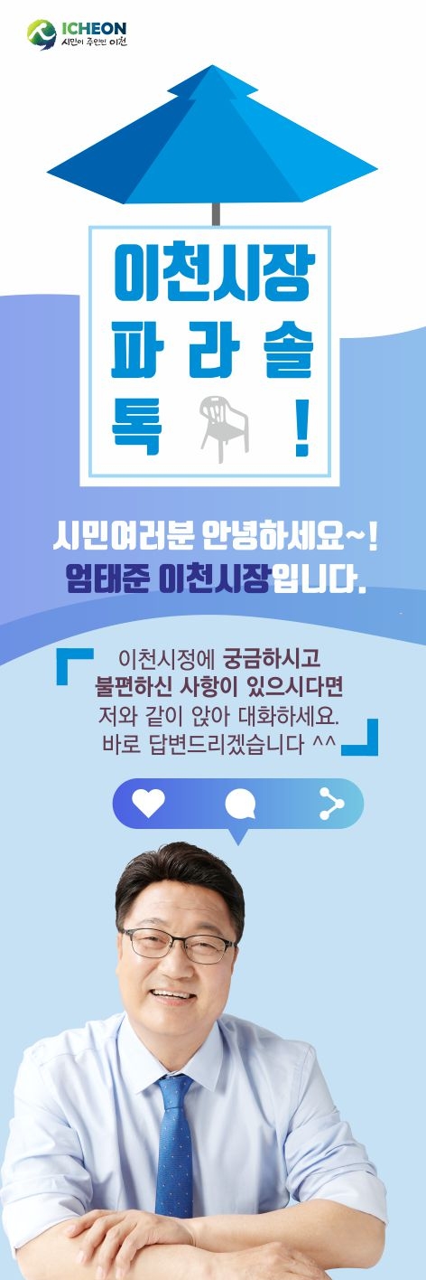 파라솔토크 운영 관련 문의는 이천시민소통폰(☎ 010-9148-1990 / 카톡, 문자만 가능) 또는 미래전략담당관실 시민소통팀(☎ 031-645-3003)으로 연락하면 된다.