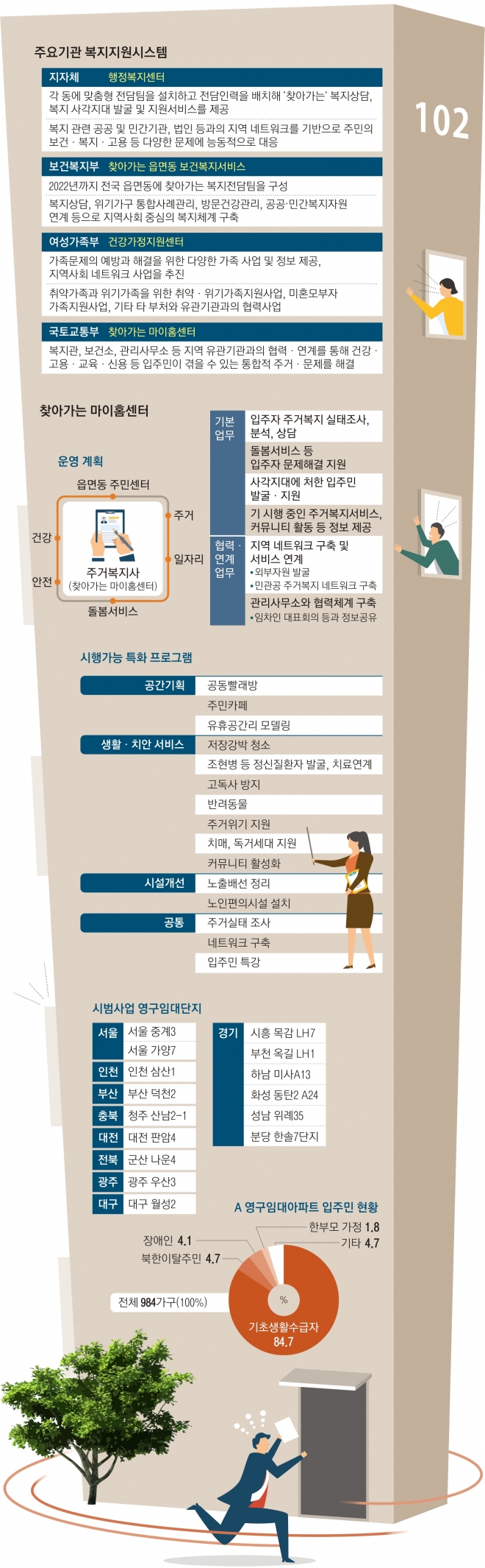 여러 수식어가 붙었지만 ‘찾아가는 마이홈센터’의 핵심은 주거복지사의 임대아파트 배치를 통해 입주자들의 복지 관련 업무를 국토부가 직접 해결하겠다는 것이다. 15개 단지의 관리사무소에 배치된 주거복지사들은 입주자를 대상으로 실태조사와 심층상담을 진행한다. 이를 통해 임대아파트 입주자들이 필요한 복지서비스를 복지관, 보건소, 관리사무소 등과 연계해 제공한다. 한마디로 공공임대아파트를 중심으로 한 새로운 복지 전달체계가 생겨나는 것이다.