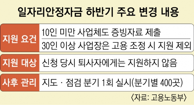 10인 미만 소규모 사업장은 그동안 직원의 퇴직이나 해고 등 고용 조정이 있어도 간단한 양식으로 경영상 어려움을 설명하면 지원금을 계속 받았다. 앞으로는 다른 사업자처럼 매출액이 실제로 얼마나 줄었는지 관련 자료를 반드시 제출해야 한다. 고령자를 고용한 30인 이상 사업장도 고용 조정이 있으면 지원을 중단한다.
