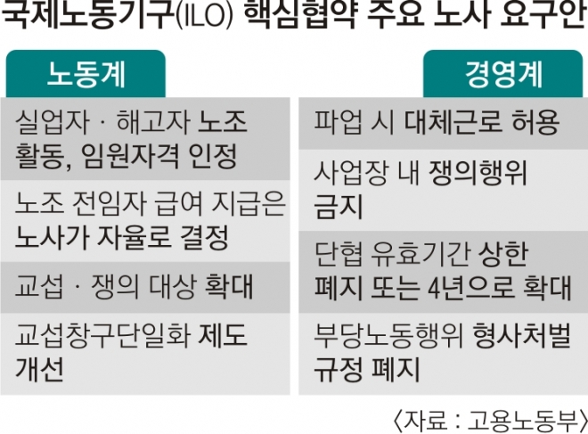 18일 한국노동연구원이 주최한 ‘ILO 핵심협약 비준과 입법적 쟁점 토론회’에서는 정부가 지난달부터 추진하고 있는 ILO 핵심협약 비준을 위해 법적으로 검토할 사안에 대해 전문가들의 제언이 이어졌다. 정부는 이런 의견을 모아 오는 9월 정기국회에 법 개정안을 제출할 계획이다.