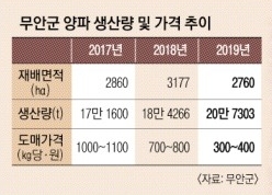 양파 풍작은 가격 폭락으로 이어졌다. 이날 현재 서울 가락동 농산물도매시장에서 ㎏당 410원에 거래되고 있다. 지난해 같은 기간 717원, 2017년 같은 기간 1020원의 절반에도 미치지 못한다. 무안 양파는 대부분 밭떼기 거래로 매매가 이뤄지는데, 올해는 평당 5000원 수준으로 지난해 8000~9000원의 절반 정도 수준이다.