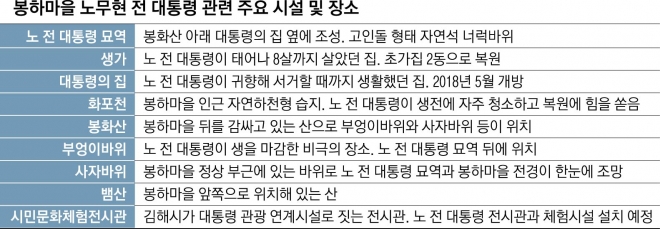 노 전 대통령은 1946년 9월 1일 봉하마을에서 태어나 어린 시절과 청년 시절을 보냈다. 사법시험 준비를 하면서 권양숙 여사를 만나 사랑을 키운 장소도 봉하마을이다. 노 전 대통령은 2008년 2월 24일 퇴임하고 봉하마을로 귀향했다. 1년 3개월 동안 주민들과 어울려 막걸리도 마시고, 친환경 농사를 짓고, 집 근처 화포천 청소도 하고, 찾아오는 관광객들과 격의 없이 얘기하며 바쁜 일상을 보내다 서거했다. 생가와 귀향해 서거할 때까지 살았던 ‘대통령의 집’, ‘느럭바위’ 묘역 등 노 전 대통령 발자취와 흔적이 마을 곳곳에 남아 있다.