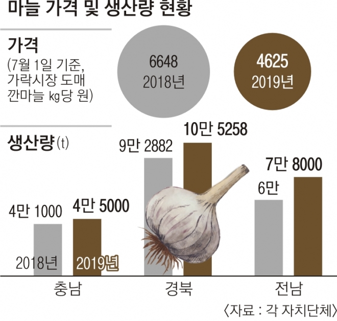 2일 충남도에 따르면 충남 지역 마늘 생산량은 지난해 4만 1000t에서 올해 4만 5000t으로 느는 등 전국에서 풍작을 이룬 마늘이 한꺼번에 출하되면서 가격이 속절없이 하락하고 있다. 실제로 깐마늘은 지난 1일 서울 가락시장에서 ㎏당 도매가가 4625원으로 지난해 같은 시기 6648원보다 30.4% 떨어졌다. 전국 마늘 생산량은 지난해 33만 2000t에서 올해는 36만 2000∼36만 8000t으로 늘어난다. 농민들은 이미 양파가 폭락한 상황이어서 마늘 가격 하락 쇼크까지 겪고 있다.