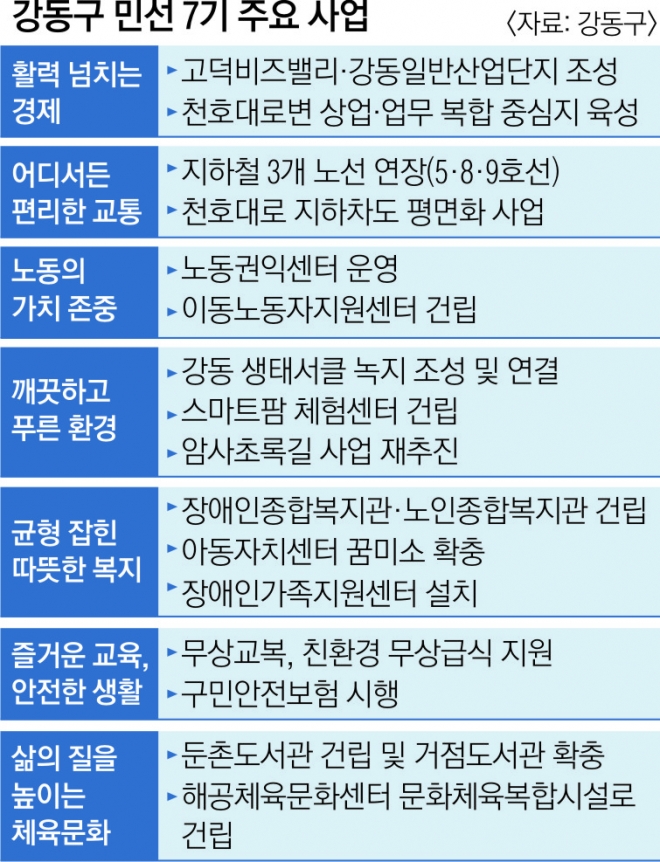 “황무지 같던 고덕·강일 지구에 아파트가 들어서는 걸 보며 저 역시 강동의 변화를 실감하며 깜짝깜짝 놀란다. 하반기부터 새로운 인구가 고덕동 등으로 들어오기 때문에 현장에 답이 있다는 생각으로 그 일대를 돌아보며 주민들의 생활에 불편한 점이 없는지 파악하고 있다. 주민들이 이용할 보도, 주변 녹지 등을 정비하고 인근 초·중·고교 등 학교 환경 개선에도 힘쓸 예정이다. 버스 도착정보시스템은 제대로 작동 하고 있는지 어린이집 등 보육 시설은 부족하지 않은지 하나하나 수시로 챙기며 보완할 계획이다.”