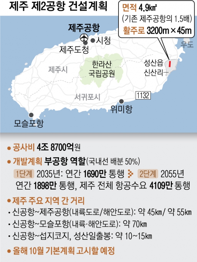 제2공항은 연간 1898만명 수용 및 처리 목표로 계획하고, 계류장·터미널 등에 단계별 건설계획을 적용해 국제선 취항과 제주사회가 우려하는 과잉 관광에 대한 대처가 가능하도록 추진한다. 국토부 관계자는 “앞으로도 제주도와 협력하고 다양한 이해관계자 의견을 충실히 수렴해 제2공항 건설을 추진할 것”이라며 “관련 기관 의견 수렴 및 협의를 거쳐 올해 10월 기본계획을 최종 고시할 계획”이라고 말했다.