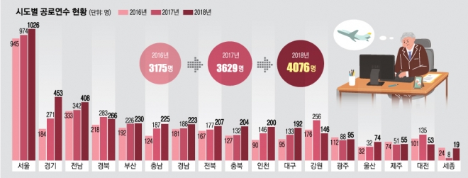 행안부에 따르면 지난해 지자체에서 공로연수에 들어간 인원은 4076명에 이른다. 전년도인 2017년 3629명에 비해 크게 늘었다. 이는 정부 부처나 시도교육청을 제외한 수치이다. 지역별로는 서울이 1026명으로 가장 많았고 경기 453명, 전남 408명, 경북 266명, 부산 230명 등의 순으로 나타났다.