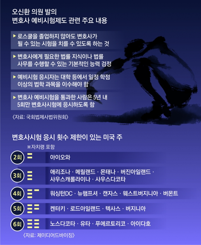 이런 내용을 담은 법안을 발의했던 오신환 바른미래당 원내대표는 “개인의 자유의지를 통제하고 법조인이 되는 것을 원천적으로 차단하는 것은 제대로 된 제도가 아니다”라면서 “꼭 로스쿨을 졸업하지 않아도 변시를 볼 수 있는 우회 통로가 마련돼야 기회의 평등이 이뤄질 수 있다”고 주장했다.