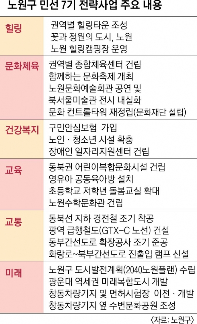 “크게 보면 힐링타운 조성, 아이 휴(休) 센터 설치, 북서울미술관 전시 내실화 등 세 가지를 꼽을 수 있다. 우선 구민들이 주말 저녁에 휴식을 취할 수 있는 공간이 부족하다. 그래서 중계동 불암산, 공릉동 화랑대역 철도공원(경춘선), 월계동 영축산 무장애숲길, 수락산 동막골 휴양림 등 4곳을 선정해 힐링타운을 조성할 계획이다. 그중에 속도가 가장 빠른 불암산 힐링타운에는 지난해 9월 사시사철 나비를 볼 수 있는 나비정원을 개장했다. 철쭉동산은 올해 말까지 완공되고 장애인 엘리베이터 전망대 공사도 시작했다. 두 번째로 지역 내 맞벌이가정 초등학교 1~3학년을 대상으로 오후 8시까지 돌봄을 제공하는 ‘아이 휴 센터’를 만들었다. 돌봄이 필요한 아이들이 지역 내에 5000여명 정도 된다. 하지만 기존 학교 돌봄 프로그램을 이용하는 3000명을 제외한 2000명이 방치돼 왔다. 그래서 지난해 말부터 초등학교가 1000명을 맡고, 구청이 1000명을 맡기로 했다. 지금까지 구에서 1000가구 이상의 아파트를 찾아내 전세를 얻고 있다. 리모델링을 통해 지난 9일까지 10호점을 개장했고 2022년까지 40호점으로 확대할 계획이다. 마지막으로 서울시립 북서울미술관 전시를 내실화하려고 한다. 지난 2일부터 9월 15일까지 천경자, 박수근, 이중섭 등 유명작가들의 근현대명화전을 진행 중이다. 내년에는 빈센트 반 고흐 등 인상파 화가들의 작품을 전시하는 ‘유럽의 명화전’을 꼭 해 보고 싶다.”