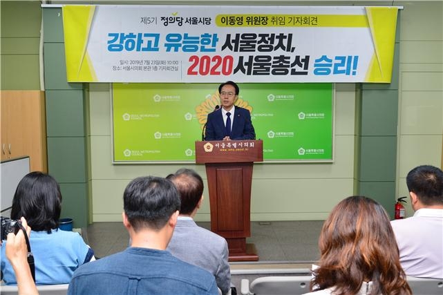 이동영 정의당 서울시당 신임위원장은 이날 기자회견에서 서울시정에 대한 입장과 대안, 2020서울총선에 대한 방향과 계획을 밝혔다. 우선 정당정치의 복원을 통해 서울시정의 대표성과 책임성을 분명히 할 것을 언급했다. 화려한 서울시정에 가려진 보이지 않는 노동에 대해 말하며 노동 밖의 노동과 손을 잡아야 한다고 강조했다. 특히 여성·청년 1인가구의 사회경제적 문제, 공공기관 간접고용의 문제 등 서울의 특성을 반영한 사회·경제·노동의 문제에 대한 대안 마련을 위해 ‘서울형 경제사회노동위원회’를 박원순 시장에게 공개 제안했다.