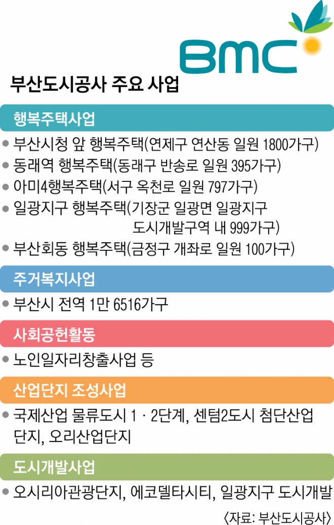 “2010년부터는 사회적 가치 실현과 도시 행복 심기에 힘쓰고 있다. 도시 성장과 함께 도시공사의 사업 추진도 양적 발전이 아닌 도시문제를 해결하고, 시민 삶에 더 구체적인 행복을 실현하는 방향으로 접근한다. 청년의 주거난과 저출산 문제 해결을 위한 행복주택 공급과 주거복지 및 도시재생사업 등이 대표 사례다. 신혼부부와 청년들에게 안정적인 보금자리를 제공하는 행복주택 사업은 아미4지구 등 5개 지구에 4091가구 건립을 추진 중이다. 최근 신혼부부의 생활에 맞게 아파트 평수를 44㎡에서 60㎡로 확장하는 변경안을 마련했다. 이들에게는 아파트 임대료를 주변 시세의 60~80% 수준으로 낮춰 청년층의 내 집 마련에 디딤돌 역할을 하도록 할 방침이다. 부산시청 앞 1800가구, 동래역 395가구, 서구 아미동 797가구, 일광지구 999가구 등 사업이 진행되고 있다. 가장 사업 추진이 빠른 동래역은 내년 1월 입주한다. 입주 대상은 39세 이하인 청년층과 신혼부부, 대학생 등이다.”
