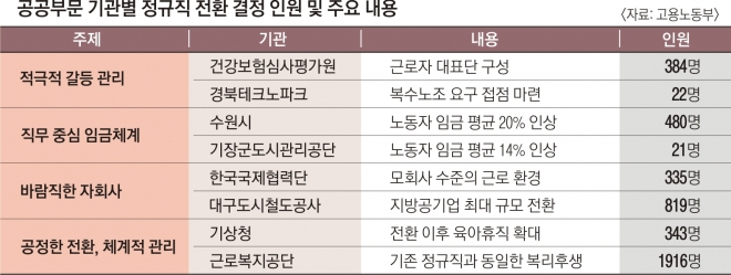 같은 날 고용부는 공공부문 정규직 전환 사례집도 내놓았다. 자회사 방식 정규직 전환을 두고 공공기관 곳곳에서 잡음이 터져 나오자 이를 잠재우려는 취지로 풀이된다. 적극적 갈등 관리로 정규직 전환을 무사히 마무리한 건강보험심사평가원과 직무 중심 임금체계를 도입한 수원시 등 사례가 실렸다.