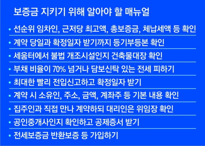 서울보증보험이나 주택도시보증공사(HUG) 등에서 전세보증보험에 가입하는 것도 피해를 예방하는 방법이다. 집주인 동의 없이도 가입이 가능하지만 주택 가격 대비 선순위 근저당액 비율이 높으면 가입할 수 없으므로 계약 전에 요건을 미리 확인해야 한다.