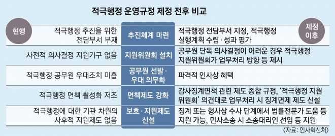 정부는 기관별로 ‘적극행정 지원위원회’를 설치해 기관별 업무 특성에 맞는 적극행정 과제를 발굴하도록 했으며 위원회 의견대로 업무를 처리한 경우 징계를 면제해 주기로 했다. 또한 적극행정의 결과로 민원인으로부터 형사 고소·고발을 당하면 법률전문가의 도움을 받을 수 있게 했다. 민사소송은 소송대리인 선임 등 소송 지원을 받도록 했다. 적극행정의 책임을 공무원 개인이 아닌 국가가 나눠서 지도록 한 것이다.