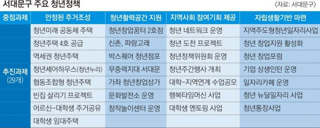 서대문구가 민선 7기에 접어들면서 청년정책에 더욱 힘을 싣고 있다. 전국에서 가장 많은 9개 대학이 자리잡은 지역 특성을 살려 주거공간, 일자리 및 창업, 문화예술 등 다양한 분야에서 청년들의 생활 전반을 지원하는 특화 정책을 앞세우는 것이다. 특히 ‘청년정책은 당장의 지원보다 청년들이 자립할 수 있도록 제반 환경을 마련해 주는 방향으로 가야 한다’는 문석진 서대문구청장의 평소 철학이 강하게 작용했다는 후문이다.