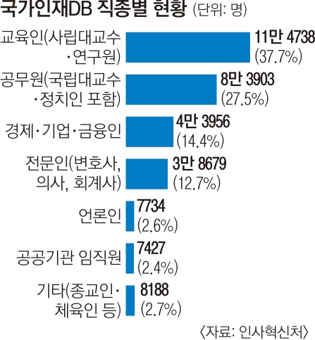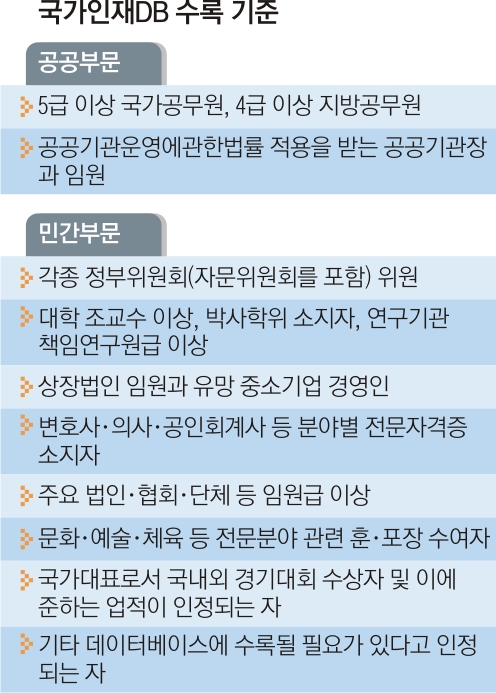 20년이 지난 올해 6월 현재 중앙부처 5급 이상·지방자치단체 4급 이상 공무원 5만 8506명과, 국민 추천과 자기 추천을 통해 등록된 민간인 24만 6119명 등 모두 30만 4625명이 등록돼 있다. 해마다 2만명 정도가 새로 등재된다. 사망자는 자동으로 말소된다. 2015년부터 최근까지 국가인재DB를 책임진 김정일 전 인사처 인재정보기획관도 행정고시(32회) 출신이자 민간 인사컨설팅 전문가로 국가인재DB에 등재된 덕분에 책임자가 돼 화제가 됐다.