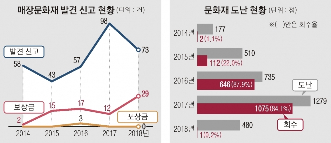 매장문화재는 우연한 기회에 발견한 사례가 많다. 밭을 갈거나 비닐하우스 공사를 하다가, 염소 사육장을 청소하다가 혹은 하천에서 물놀이하다가 발견하는 사례도 있다. 2014~2018년 5년 동안 일반 국민이 찾아내 신고한 매장문화재는 모두 329건에 이른다. 이 가운데 75건이 보상금을 받았다. 확률로 따지자면 4건 중 1건 정도쯤 되는 셈이다.