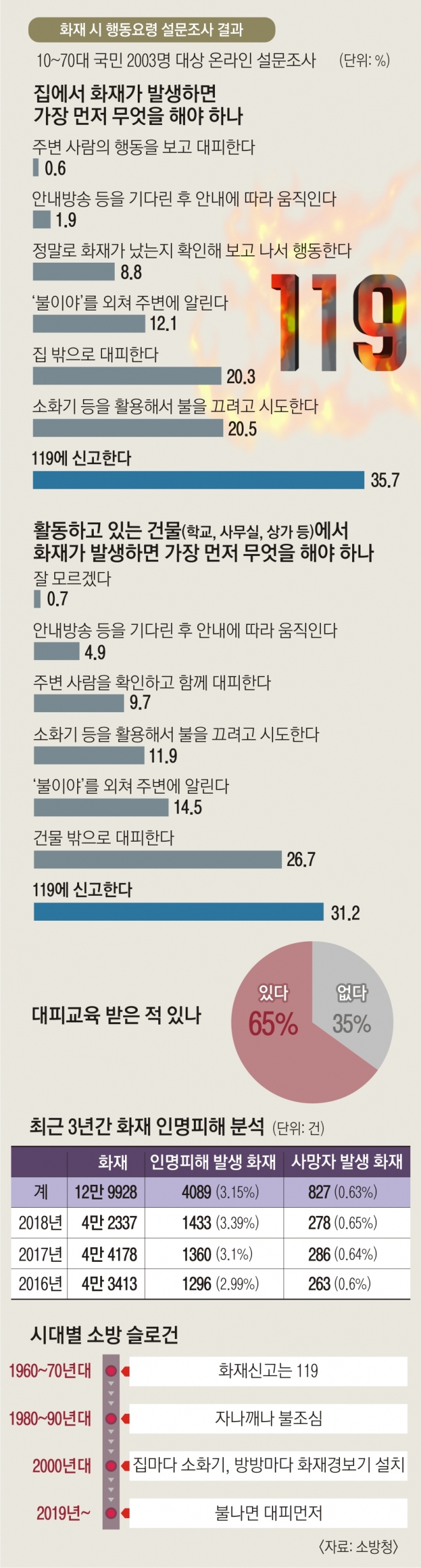 실제로 국민은 화재 시 행동요령에 대한 우선순위를 잘못 인식하는 경우가 많았다. 소방청이 지난 3월에 국민 2003명을 대상으로 실시한 설문조사에서 ‘집에서 화재가 발생하거나 화재경보기가 울렸다면 가장 먼저 해야 할 일은 무엇인가’라는 질문에 대해 ‘119에 신고한다’(35.7%)는 답변이 가장 많았다. ‘소화기 등을 활용해서 불을 끄려고 시도한다’(20.5%)는 답변이 바로 뒤를 이었고, ‘집 밖으로 대피한다’(20.3%)는 답변은 3위에 그쳤다. 화재 장소를 집에서 직장으로 옮겨 질문해도 여전히 119에 신고한다는 답변이 수위를 차지했다.