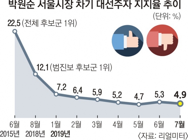 박 시장은 대선 유력후보로 거론돼 왔지만 최근 실시된 한 차기 대선주자 여론조사에서는 4%대에 머물렀다. 오히려 조국 법무부 장관이 차기 대선 주자 선호도 3위(7.0%)로 박 시장을 제친 상태다. 2016년 박 시장이 추진했던 청년기본수당 의제는 당시 성남지사인 이재명 경기지사가 선점, 기회를 놓쳤다. ‘여의도 통개발’ 발언을 둘러싼 국토교통부와의 신경전은 지지율 추락의 계기가 됐다. 엎친 데 덮친 격이 된 것이다.