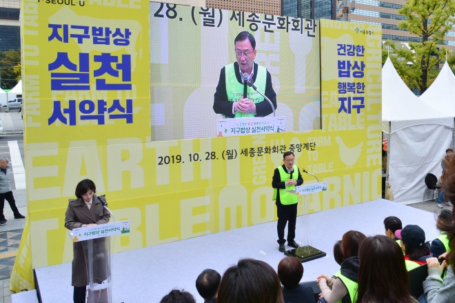 ‘지구밥상 실천 서약식’은 서울 먹거리 문화축제 주간을 맞아 ‘나, 우리 그리고 지구환경을 살리는 지속가능한 먹거리 실천’을 위해 열렸다. 서약서 내용은 △‘땅과 물을 살리는 농업을 지키겠습니다’ △‘식품을 현명하게 고르겠습니다’ △‘먹거리를 알맞게 조리하겠습니다’ △‘가족과 이웃과 함께 먹겠습니다’ △‘남은 음식을 바르게 버리겠습니다’ 등이다. 박기열 부의장은 “환경파괴, 기후변화로 인해 후손들의 먹거리가 위협받지 않도록 우리 모두가 ‘지구밥상’을 실천해야 할 것”이라고 말했다.