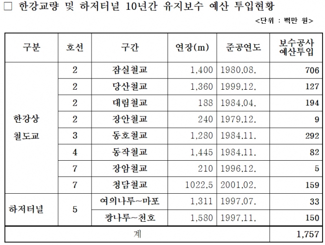 정 의원에 따르면 ‘1~8호선 한강교량 및 하저터널’ 중에는 준공연도가 40년이 되어가는 철교도 있고, 다른 철교나 하저터널도 오랜 세월 동안 자연적인 부식 등으로 관리가 필요함에도 불구하고 유지보수 예산이 부족해 제대로 관리가 되지 않아 개선이 필요하다고 지적하였다.