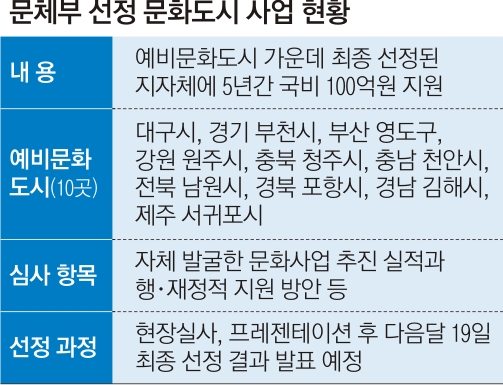 문체부는 지난해 문화도시 예비도시로 지정된 대구시와 충북 청주시, 경남 김해시, 경기 부천시, 경북 포항시 등 10곳을 대상으로 자체 발굴한 문화사업 등을 심사해 다음달 19일쯤 선정 결과를 발표할 계획이다. 문체부는 몇 곳을 선정할지 심사 결과를 봐야 한다며 말을 아끼고 있다.