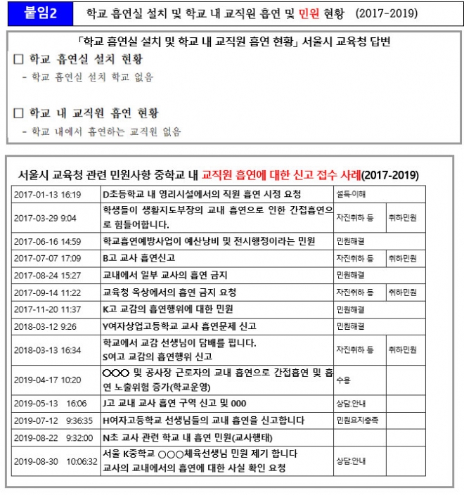 전 의원은 교육청 자체 학생, 교직원 대상 흡연 실태조사 조차 없어 ‘학교흡연예방사업’ 방향의 재검토가 필요하다고 밝혔다.