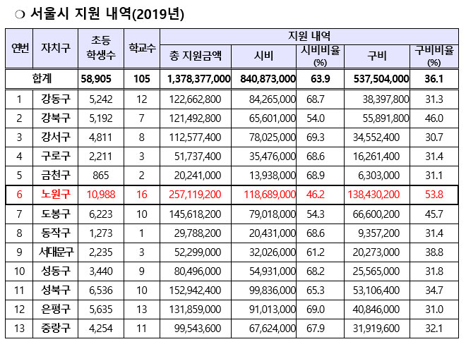 그리고 “서울시와 자치구 7:3 매칭사업임에도 불구하고 자치구 전체 학생 수를 기준으로 예산을 배정하다보니 사업 신청을 많이 한 노원구의 경우 시비 46.2%, 구비 53.8%가 투입되어, 오히려 자치구에서 38,430,200원 예산이 추가 편성 지출되었다”며, 합리적인 자치구 지원예산 기준을 마련해 줄 것을 요구했다.