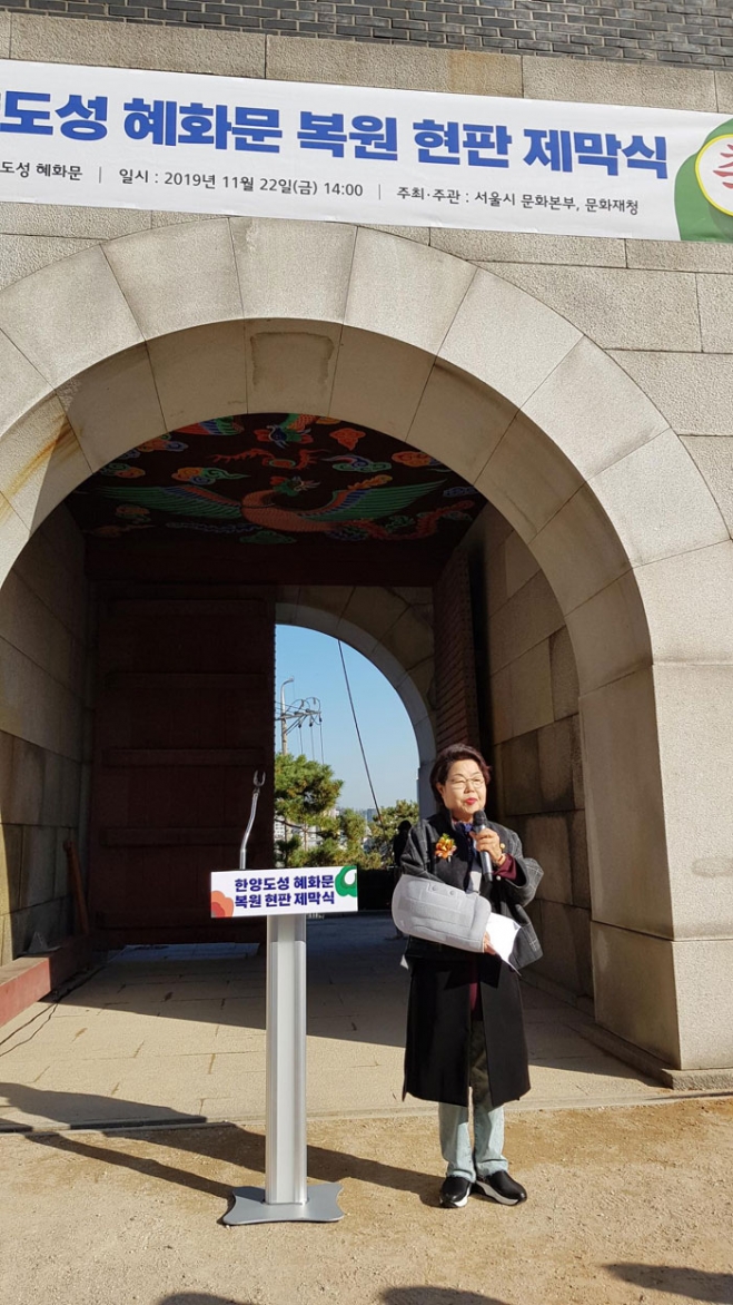 김춘례 의원은 “혜화문과 같은 문화유산에 깊은 관심과 애정을 가지고 이를 보존하기 위해 노력해야 할 것”이라며, “우리의 소유가 아닌, 대대로 후손에게 물려줄 유산으로 여겨야 한다. 혜화문이 원래의 제 모습을 되찾기까지 애써주신 서울시와 관계자 모두에게 깊은 감사를 드린다”고 축사를 마쳤다.