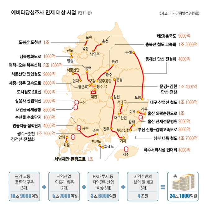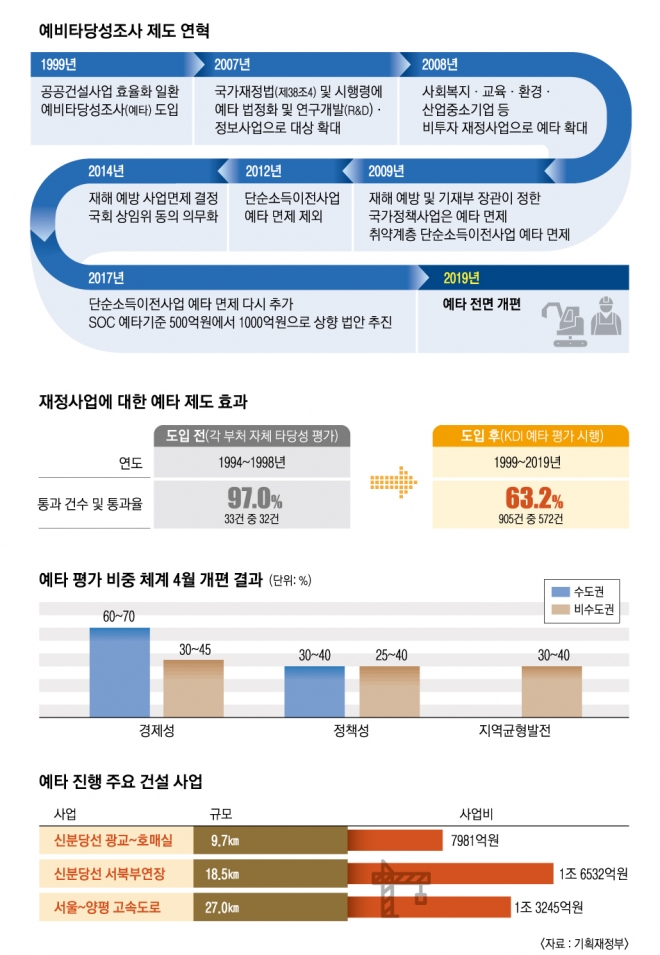 예타가 지역개발 사업을 막는 ‘통곡의 벽’이 되고 있다는 지적이 나오자 지난 4월 기재부가 20년 만에 예타 제도 개편안을 내놨다. 개편안은 모든 지역에 동일하게 적용됐던 평가 기준을 수도권은 ‘경제성’, 비수도권은 ‘지역균형발전’의 평가 비중을 높인 게 핵심이다. 수도권 사업의 예타는 경제성(평가 비중 60~70%)과 정책성(30~40%)만으로 평가하고, 감점 요인이었던 지역균형 항목은 사라졌다. 또 비수도권 사업의 예타는 경제성 비중이 30~45%로 이전보다 5% 포인트 줄어드는 대신 지역균형 평가가 30~40%로 5% 포인트 늘어났다. 기재부 관계자는 “현 정부의 기조에 맞춰 지역사업을 빠르게 추진될 수 있도록 평균 19개월인 평가 기간도 1년으로 줄이기로 했다”고 설명했다. 이와는 별도로 문재인 정부는 지역균형발전을 위해 올 초 23개 사업(24조 1000억원 규모)에 대해 예타를 면제했다.