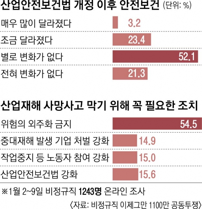 비정규직을 위한 단체 ‘비정규직이제그만’은 비정규직 1243명을 대상으로 설문조사를 한 결과 73.4%가 직장의 안전보건 문제가 달라지지 않았다고 응답했다고 14일 밝혔다. 이 중 별로 변화가 없다는 응답은 52.1%였고, 전혀 변화가 없다는 답변도 21.3%에 달했다.