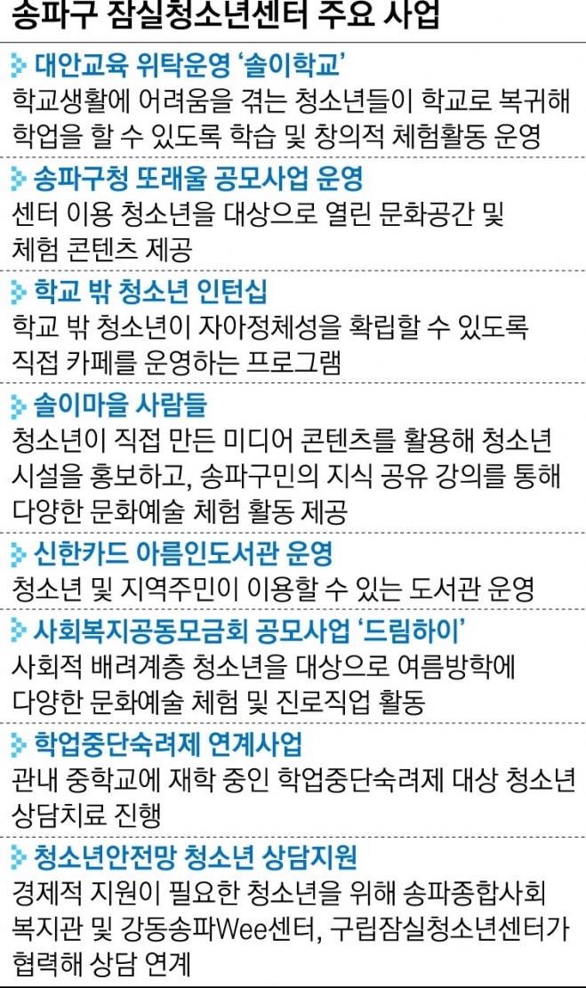 실제로 잠실청소년센터에서는 다양한 체험 프로그램을 운영하고 있다. 대표적인 예가 ‘포이(4E)마을 아카데미’다. 즐거움(Enjoy), 성장(Evolution), 배움(Education), 자유(Exit) 등 단어 4개의 영문 첫 글자에서 이름을 따왔다. 청소년뿐 아니라 지역 주민을 대상으로 맞춤형 프로그램을 개발·제공해 아이들과 가족들이 함께 성장해 나갈 수 있도록 돕는 교육문화 프로그램이다. 캘리그래피, 가죽공예, 케이팝(k-pop) 댄스, 통기타, 플루트, 배드민턴, 농구, 요가, 클라이밍 등 취미 및 생활체육활동부터 바리스타, 제빵사, 쇼콜라티에 등 직업체험 프로그램, 창의수학, 주산과 암산, 창의논술, 한국사 등 학습능력 향상 프로그램, 3차원(3D)창의공예, 언플러그드 코딩 등 제4차 산업혁명에 대비한 정보기술(IT) 융합 사고력 프로그램까지 두루 갖췄다. 지난해 8월에는 청소년들이 학업 중 스트레스를 해소하고 친구들과 관계를 형성할 수 있도록 하는 휴식 프로그램 ‘별이 빛나는 포이’ 무박 2일 캠프를 진행하기도 했다. 구는 지난 1년 동안 인기 있었던 프로그램과 주민 요청 프로그램 등을 취합해 포이마을아카데미 프로그램을 더욱 확대해 나간다는 방침이다.
