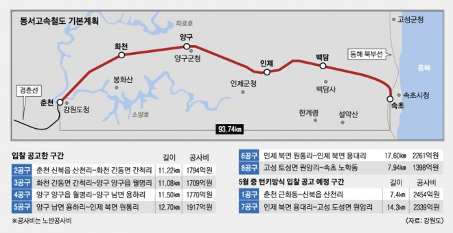 최대 난코스인 1공구 구간의 춘천역 지하화와 7공구 미시령터널 구간은 이번 입찰에서 빠졌다. 유청담 강원도 철도시설팀 주무관은 “이들 구간은 많은 공사비와 기간이 필요한 구간으로 이르면 5월 중 설계와 시공을 동시에 시행하는 턴키방식으로 별도 입찰이 시작된다”고 말했다.