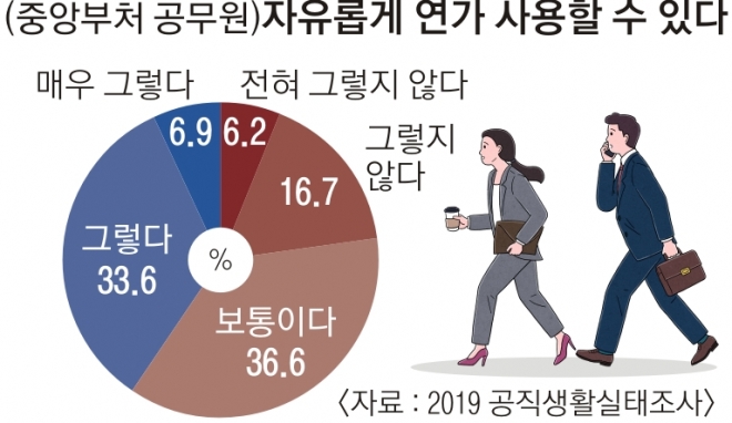 연가가 “그림의 떡”이 된 이유로는 ‘과도한 업무량’과 ‘조직 내 분위기’가 꼽힌다. ‘2019 공직생활실태조사’를 보면 중앙부처 공무원 중 평소 업무량이 ‘많은 수준’이라고 답한 비중은 42.3%였다. ‘매우 많은 수준’도 16.7%나 됐다. 원인으로는 49.9%가 인력 부족을, 25.1%는 과도한 업무 할당을 꼽았다. B부처 과장은 “지난해 상반기에는 업무 부담 때문에 21일 연가 중 겨우 3일을 썼다”고 말했다.