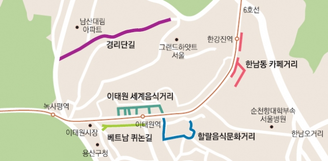 한남동 고급 아파트 ‘나인원 한남’ 뒷골목에는 7억원을 들여 카페거리를 조성한다. 연예인, 기업인 등이 몰려 사는 최고급 아파트 인근에는 이색 맛집, 카페, 상가가 몰려 있어 이미 젊은이들에게 입소문이 나 있다. 구는 한남동 뒷골목에서 이태원으로 이어지는 길 끝에 있는 용산공예관과 연계해 특화 상권을 만들기로 했다.