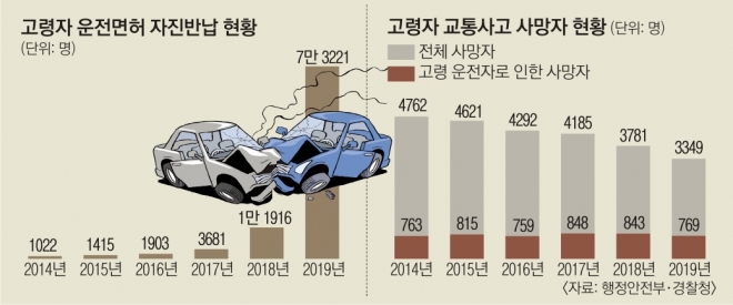정부가 고령 운전자에게 인센티브를 지원하면서 실제 2014년 1022건에 불과했던 고령 운전자의 면허 반납은 지난해 7만 3221건까지 늘어났다. 이낙연 전 국무총리도 67세였던 지난해 ‘교통사고 줄이기 한마음 대회’에 참석해 “저도 늦지 않게 운전면허증을 반납하겠다는 약속의 말씀을 드린다”고 말했다.