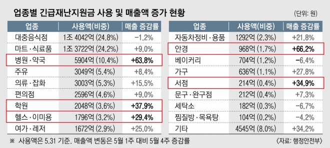 업종별로 5월 첫째주 대비 넷째주 매출액 증가율을 보면 안경이 66.2%였고, 병원·약국(63.8%), 학원(37.9%), 서점(34.9%), 헬스·이미용(29.4%)이 뒤를 이었다. 행안부 관계자는 “매출액 부분은 모든 카드의 매출액을 다 합한 거라서 지원금의 효과라고 추정할 뿐”이라고 말했다.